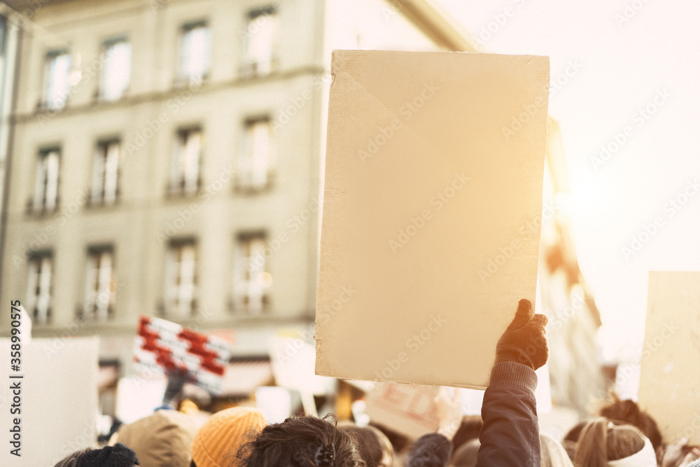 Crowd of people with placards and posters protest on the city street - Demonstrators on road for black lives matter campaign - Marching and no racism concept - Focus on hand with glove