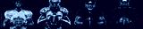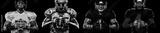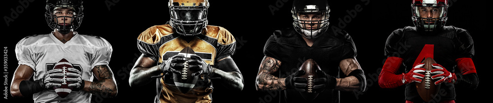 American football player, sportsman in helmet on dark background. Black and white photo. Sport wallpaper.