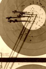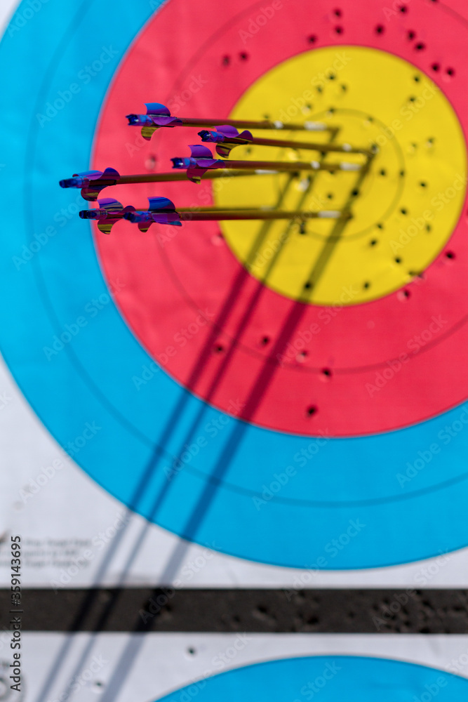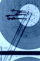 Vertical shot of blue Olympic archery arrows and their shades in an archery paper target all in the center.