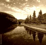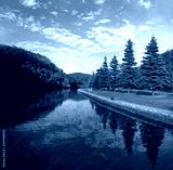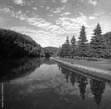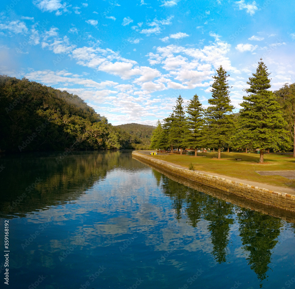 Beautiful morning view of Cockle creek with reflection blue light cloudy sky, mountains and trees, Bobbin Head, Ku-ring-gai Chase National Park, New South Wales, Australia