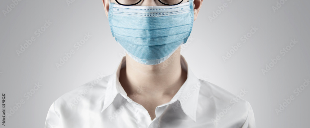 a boy student or patient wearing face protective mask against coronavirus. banner panoramic for medical professional and website background