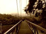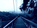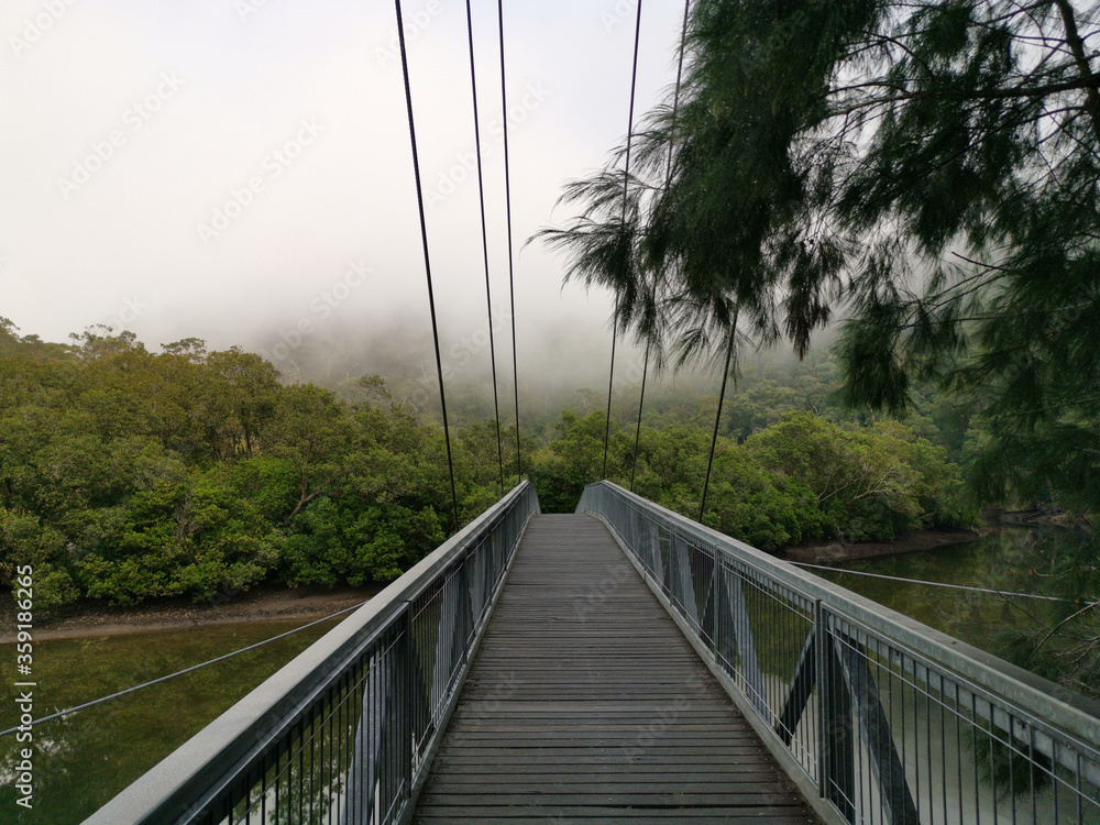 Early morning foggy view of suspension footbridge over Cowan creek, Bobbin Head, Ku-ring-gai Chase National Park, New South Wales, Australia