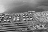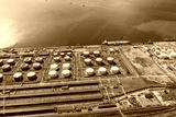 Huge port with oil tanks for storing liquid fuel on the seashore.