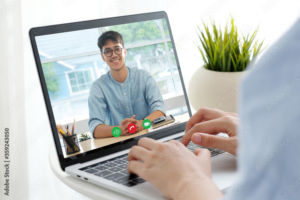 Video conference, Work from home, Asian man and woman making video call to business team with virtual web