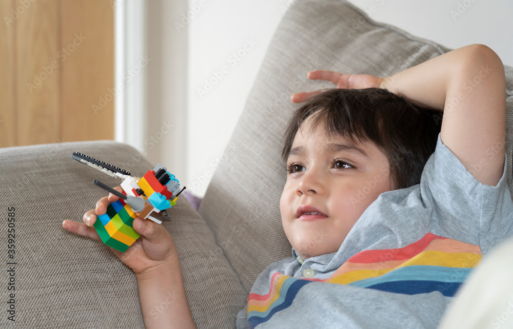 Cropped shot happy kid lying on sofa watching TV, Candid shot Positive child boy with smiling face relaxing at home, New normal lifestyle concept