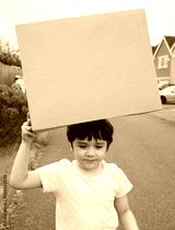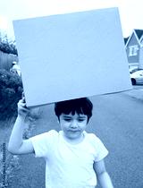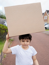 Portrait active Kid putting cardboard box on his head, Happy child boy playing outdoor holding brown paper box and walking on the road. Concept for DIY or Recyling toys idea for kids