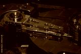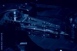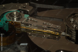 Macro photo of magnetic head, mirrored magnetic disk and spindle. Part of detail view of internal structure of HDD.