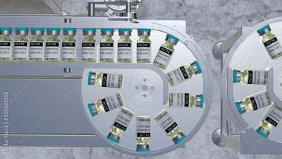 Sars-cov-2 coronavirus vaccine on a production line in a pharmaceutical factory. 3D illustration.