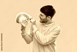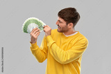 people concept - smiling young man in yellow sweatshirt with money over grey background