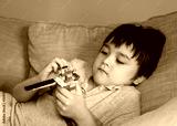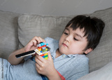 6-7 yearold boy lying on sofa playing with building coloufull blocks, Young boy concentrated with creating his own new toy form plastic blocks,Child relaxing at home on weekend.