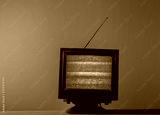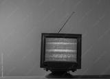 Mini Retro tv antenna receiver. Old fashioned TV set. Pink blue gradient neon light. Television noise, no signal. 80s retro wave
