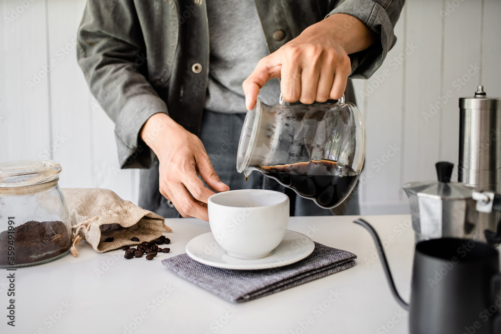 barista poured water of coffee on cup with equipment, tool brewing on bar at kitchen home