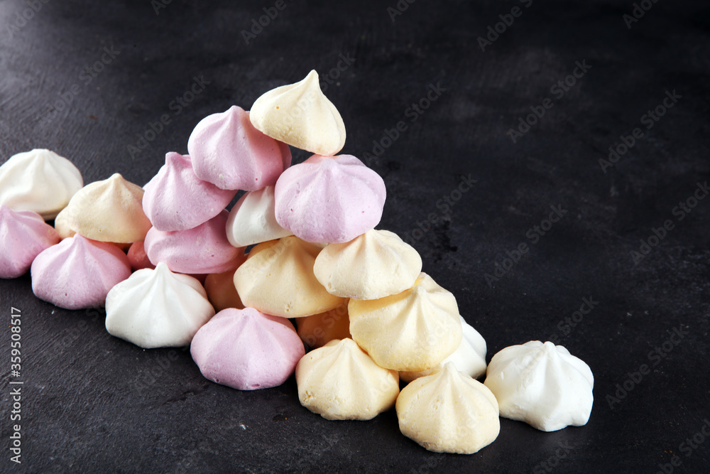 Meringue. Crispy white and pink twisted meringue. Concept love of sweet on table