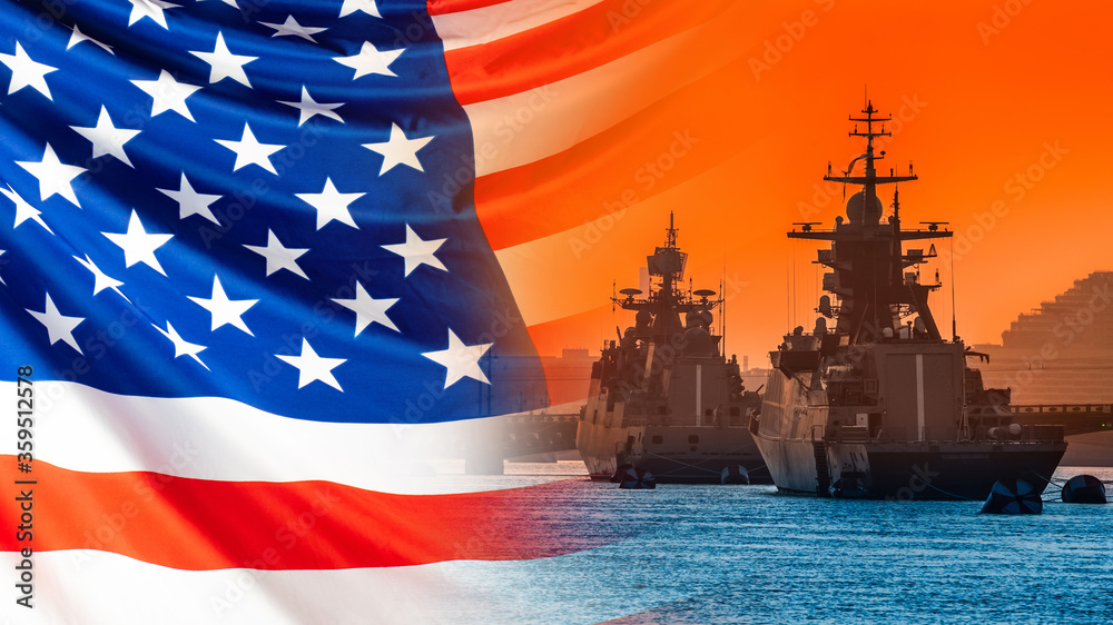 Moored warships on the background of the American flag. American fleet. Naval forces of the United States. The Navy of America. Equipment of the American army. Protecting America's water borders.