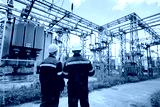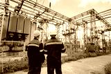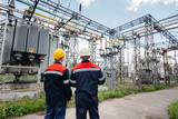 Two specialist electrical substation engineers inspect modern high-voltage equipment. Energy. Industry