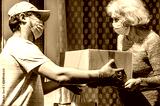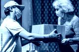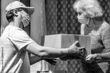 Young male volunteer in mask gives an elderly woman boxes with food near her house. Son man helps a single elderly mother. Family support, caring. Quarantined, isolated. Coronavirus covid-19. Donation