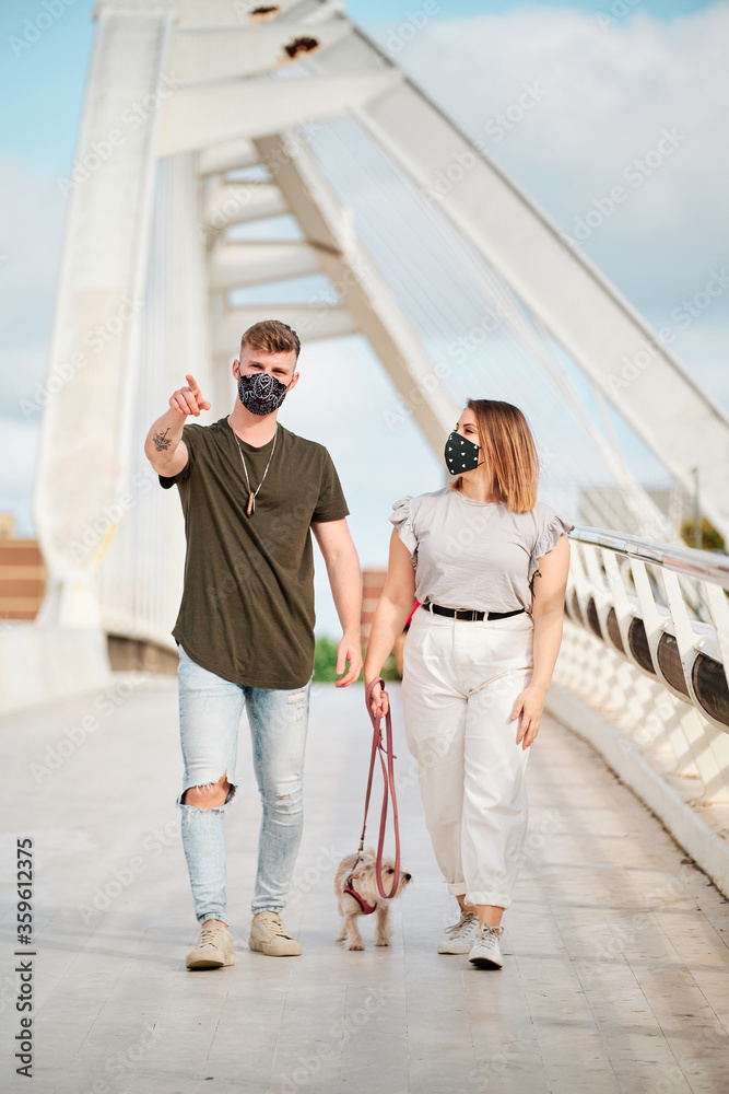Curvy woman and handsome man wearing face mask taking a walk with their dog - coronavirus concept
