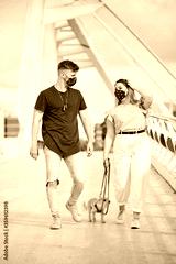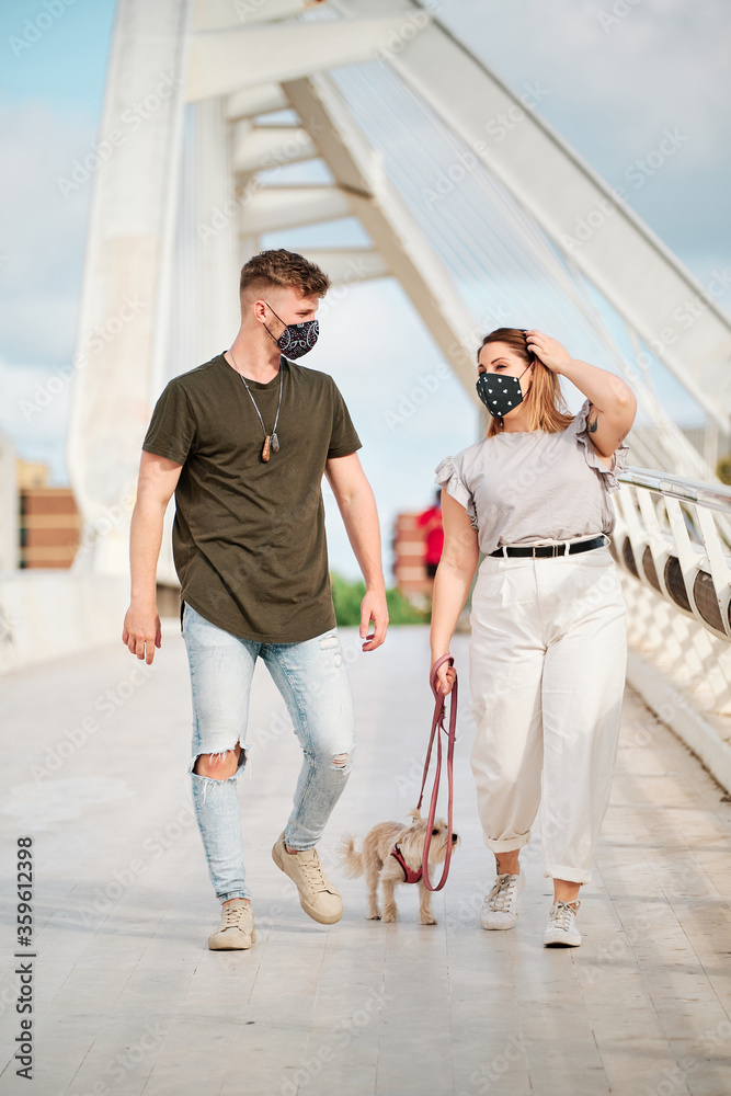 Curvy woman and handsome man wearing face mask taking a walk with their dog - coronavirus concept