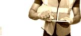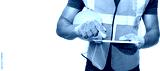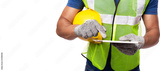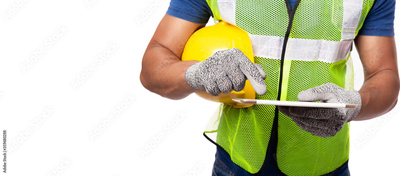 Engineer man working on digital tablet computer at worksite or industry. Blue collar worker plan project by use tablet. Handsome young industrial worker hold hard hat, safety glove, reflective vest