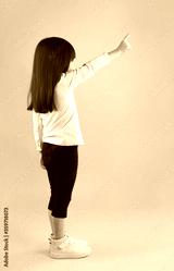 Back view of little girl pointing at wall. Rear view. Isolated on blue background.