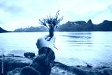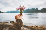 Hand holding flowers bouquet foggy mountains landscape Travel lifestyle vacations outdoor woman walking alone in Norway