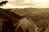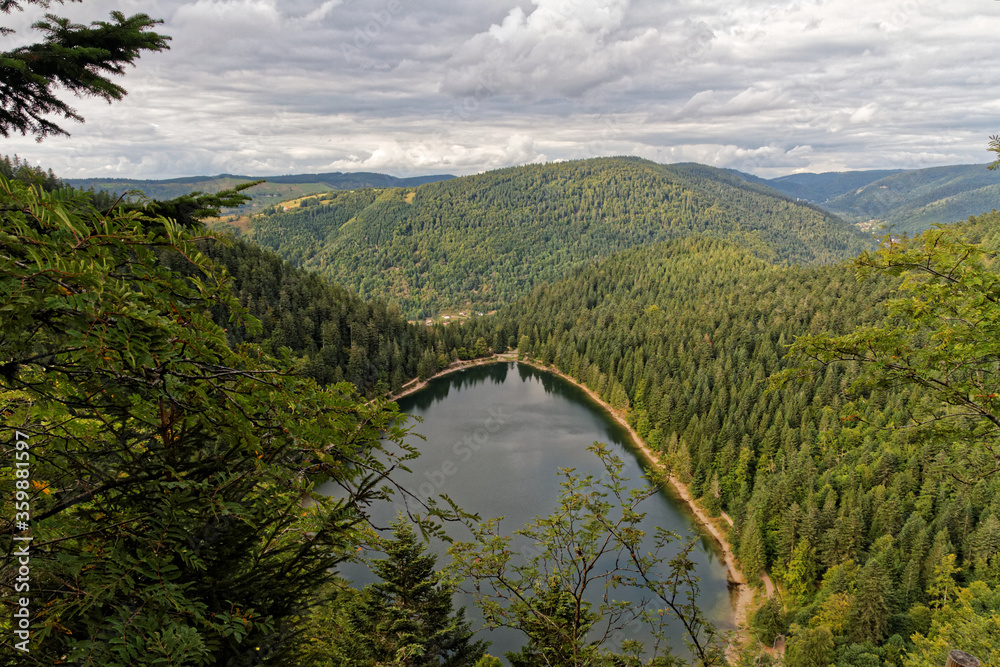 Scenic top view of mountain lake surrounded by trees, Vosges, France