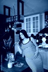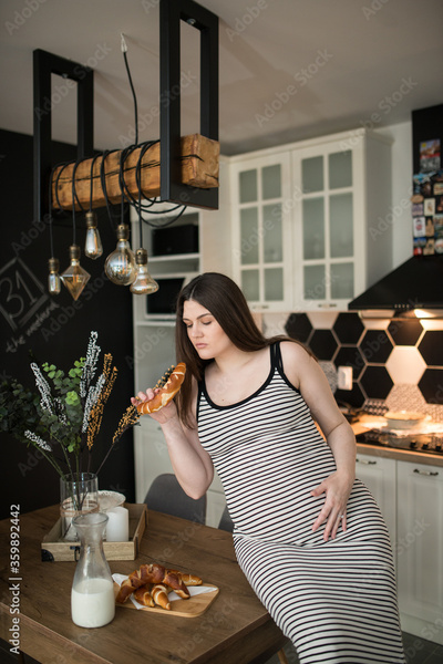 young pregnant woman in her kitchen eating a muffin. Pregnant woman in the kitchen sits at a table and eats