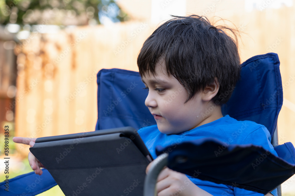Active kid sitting on chair in the garden playing game or watching cartoons on tablet ,Happy young boy with sweat face relaxing in the garden on sunny day summer, New normal lifestyle oncept