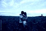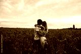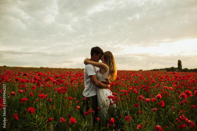 Romantic young couple hug among red beautiful poppy field. Freedom, family and love concept. Man and woman enjoy spending time together among red flowers. Copy space.