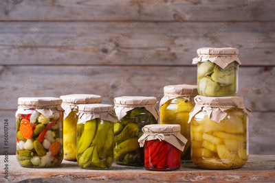 Homemade preserved and fermented food, pickled and marinated vegetables