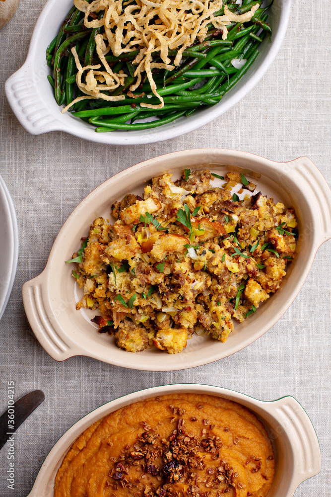 Traditional Thanksgiving sides, green beans casserole, stuffing and sweet potatoes