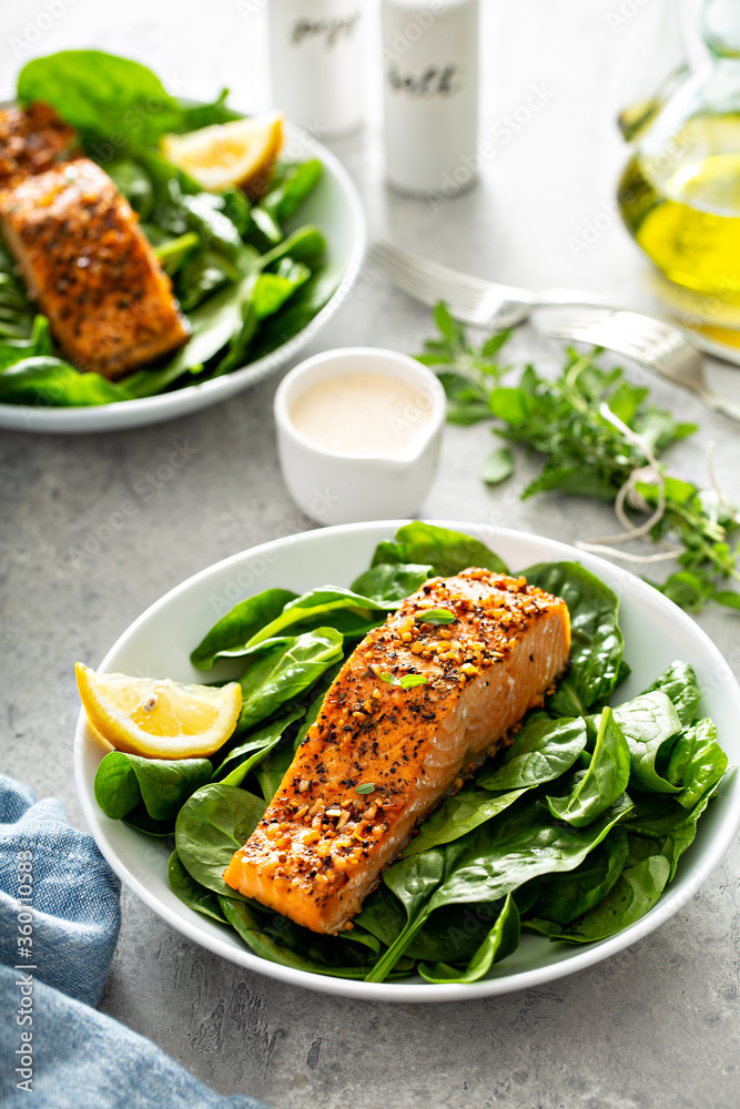 Cedar plank grilled salmon with spinach and spicy cream sauce