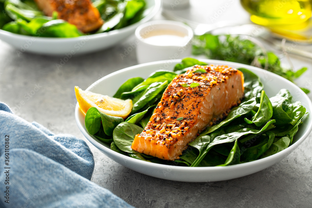 Cedar plank grilled salmon with spinach and spicy cream sauce