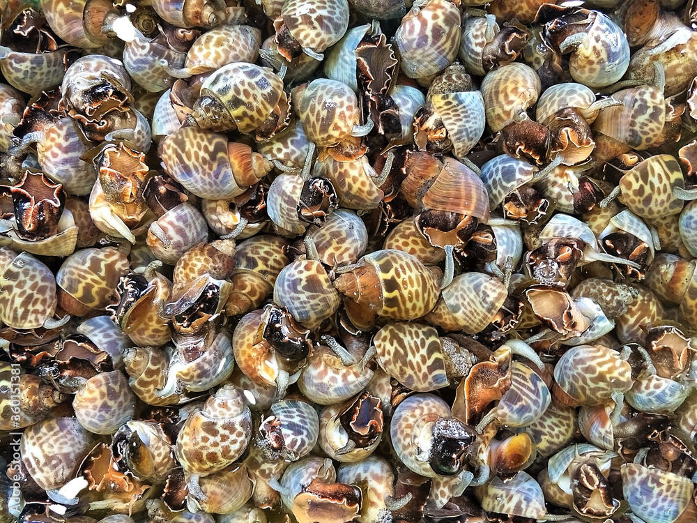 lot of live fresh Spotted babylon shell lay inside the water tray for sale at local market in Phuket Thailand