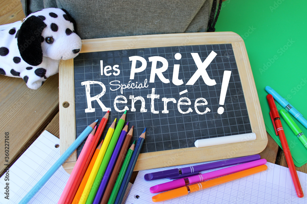 Ardoise, tableau, c'est la rentrée ! Fournitures de rentrée scolaire : cahier, crayon, cartable...