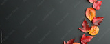 Creative Top view flat lay autumn composition Red, orange falling leaves on stylish trendy black background copy space, fall harvest thanksgiving halloween promotion flyers. Long wide banner