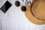 Traveler accessories, luxury hat, sun glasses, camera and smart phone on white white wood background with copy space. Travel vacation concept. Summer background. Flat lay, top view.