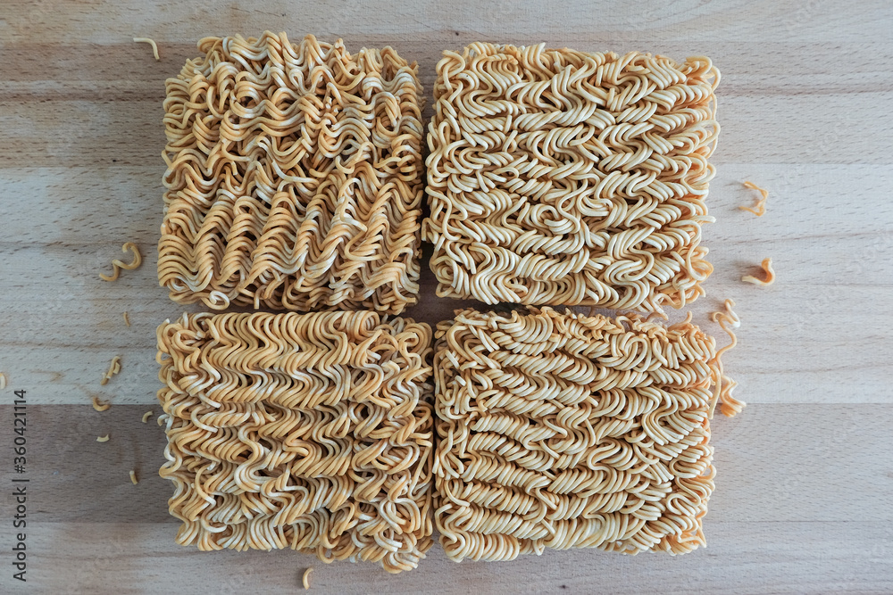 Instant noodles prepare on brown wooden chopping board