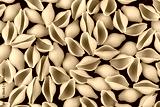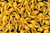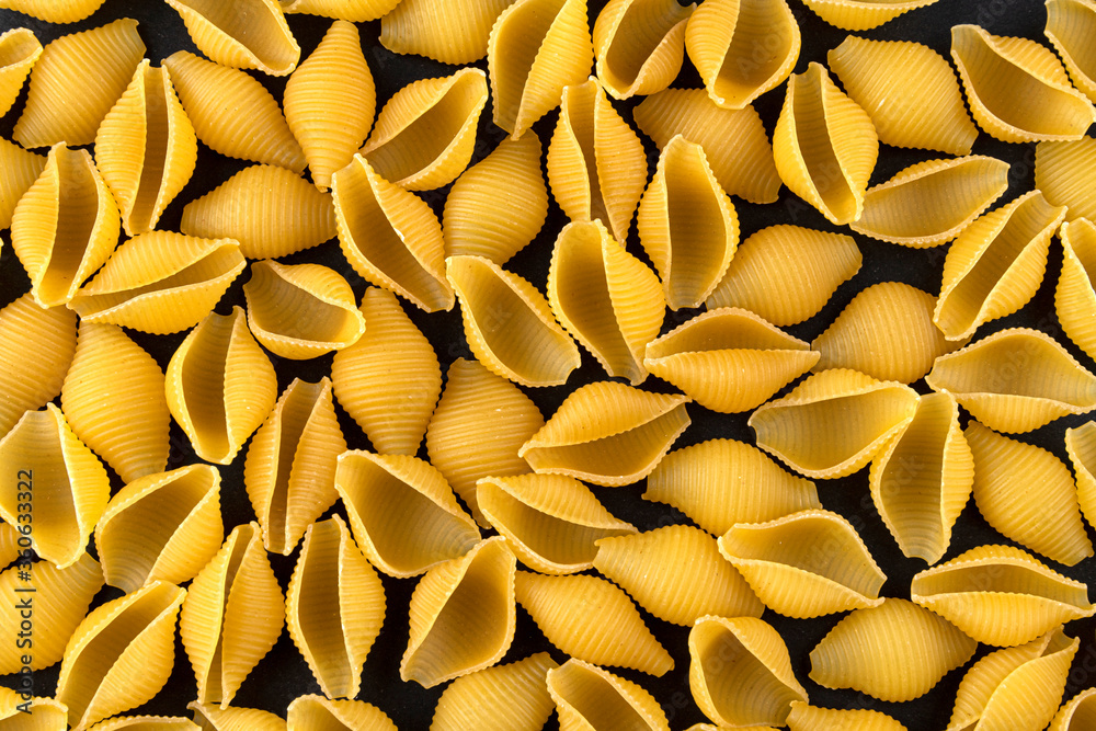 Dry shell pasta pattern on black background, top view