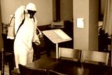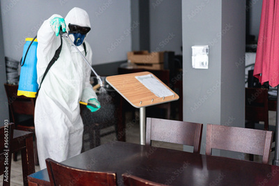 Worker in hazmat suit wearing face mask protection while making disinfection inside bar restaurant - Coronavirus decontamination for people healthcare - Focus on left hand