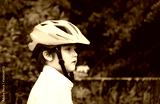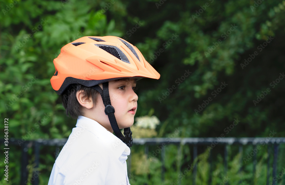 Healthy child boy wearing a bike helmet, Outdoors portrait Happy kid with smiling face wearing a cycling helmet riding a bicycle in the park, Concept for safety, childhood and freedom