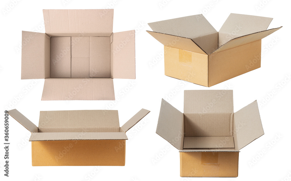 Open cardboard boxes in different format, isolated with clipping path on white background