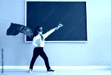 Back to school. Schoolgirl in a superhero costume on the background of a green school board in the classroom.