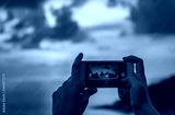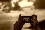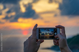 Girl's hand hold a smartphone to take a photography of sunset scenery.