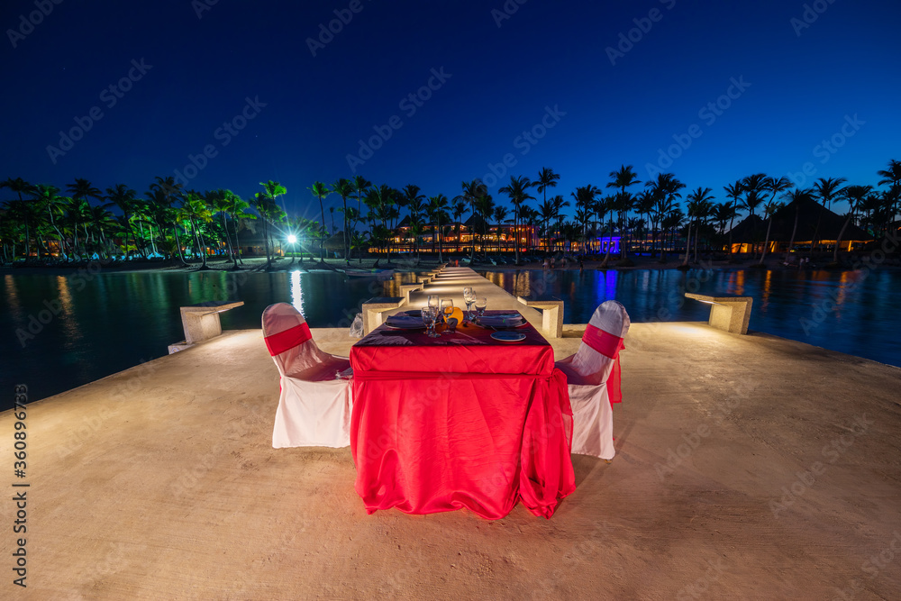 Romantic dinner on the beach. Celebrating honeymoon on exotic island