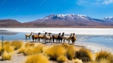 Llamas in the lagoon Hedionda, Bolivia. Llamas in beautiful landscape with lake and mountains in the Bolivian desert