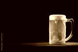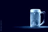 cold mug with beer, with overflowing foam, on wooden table and dark background