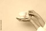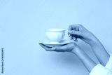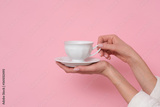 Coffe mood. Woman in white bath robe is holding a cup of coffee. Studio shoot on pink background.