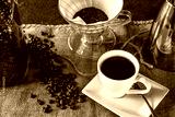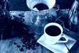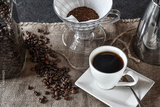 hot delicous white cup of coffee - made with grounded coffe beans and a hand filter