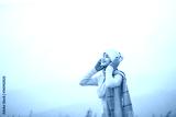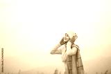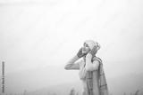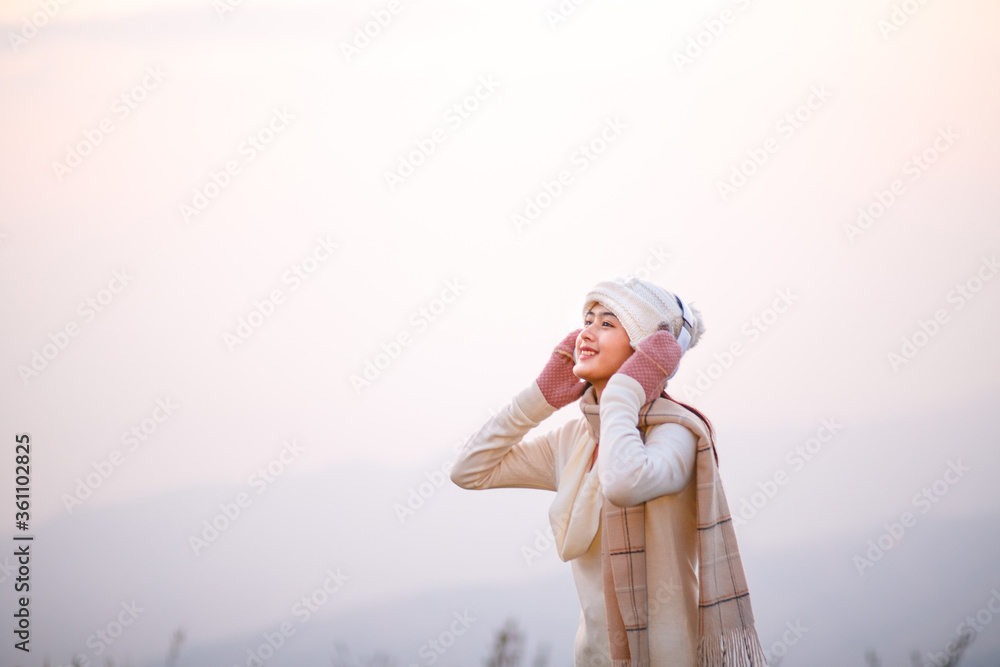 Side view romantic woman relaxing on the top of mountain under blue sky with sunlight at sunny winter day, travel vacation, landscape mountains background.